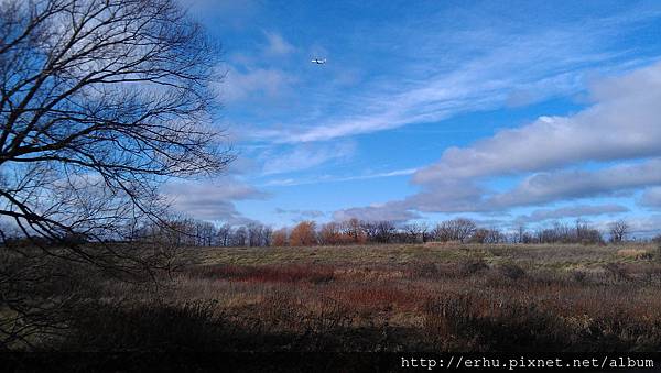 若仔細看照片, 還可以看到有一架飛機正在起飛. 這個步道是我們公司許多人很愛在吃完午餐後來的地方, 因為每天絕大多數的時間都是坐著, 若是吃完午餐後還得繼續坐著, 實在是影響消化及戕害健康, 所以許多人都會趁著飯後過來晃晃, 我也是能來就盡量來. 我一些同事都說曾經在這個步道上看過鹿, 狼, 狐狸之類的動物, 可是我到目前只有看過鴨子, 松鼠和臭鼬等相對常見的動物, 只有在傍晚時會偶爾聽到狼嚎, 看來果然待得不夠久......